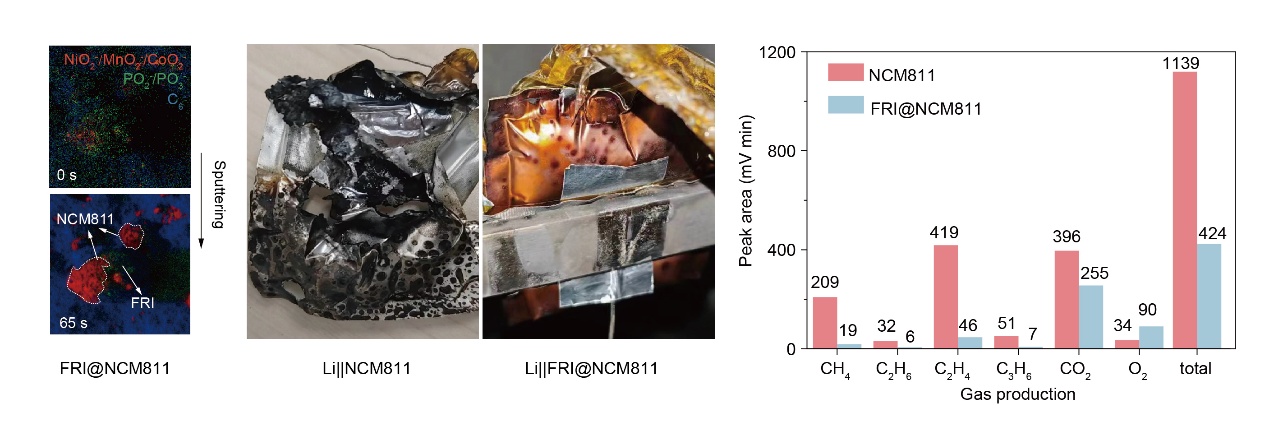 在国家自然科学基金委、中国科学院和北京分子科学国家研究中心的支持下,化学所分子纳米结构与纳米技术实验室白春礼研究员、郭玉国研究员、张莹副研究员,基于前期在电池热安全机制(Sci. Adv. 2023, 9(5): eade5802)和聚合物电解质设计(Adv. Energy Mater. 2020, 10 (3) , 1903325)的研究积累,创新提出"阻燃界面用于智能气体管理"的设计策略。该团队在正极内部构建阻燃界面(FRI),通过温度响应机制实现双重防护:当电芯温度升至100℃时,FRIs释放含磷自由基并迁移至负极表面,猝灭电解液热解产生的H·、CH·等活性基团,使可燃气体生成量下降 63%;同时抑制正极49%的氧气释放,从源头切断爆炸反应链。在热滥用测试中,首次实现0.6Ah锂金属软包电芯零爆炸。